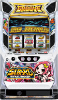 大都技研が誇るキラーコンテンツのひとつ「シェイク」シリーズに待望の新作が登場! 本機『SHAKE BONUS TRIGGER』はBBのループが魅力のBT機だ。ボーナスはBBとRBの2種類。BB当選時は必ずBTが発動し、平均約400枚、最低約300枚獲得できる。BB終了後に突入するBONUS TRIGGER CHANCEでは、当選するJACによって獲得枚数&BB継続が決定。SJACまたは継続JAC当選ならBBループ濃厚、終了JAC当選ならBB終了濃厚となる。BBループ率は設定によって異なり、奇数設定の方がBBループ率は高くなっている(その分、偶数設定は初当り確率が高い)ボーナス中は枚数調整(逆押しナディア狙いを1回だけ実践)によって、最大枚数を獲得可能。BB中はJAC当選のたびに実践する必要あるので注意したい。また、RB中は枚数調整とは別に、カットイン発生時に青7を狙う技術介入が用意されている。こちらは何度も発生する可能性があり、成功するたびに獲得枚数が増加する。BONUS TRIGGER CHANCE中も技術介入要素あり。「黒もや」発生時に左リール上 or 中段に黒BARを停止させることでチャレンジ役(12枚役)を獲得できるぞ。